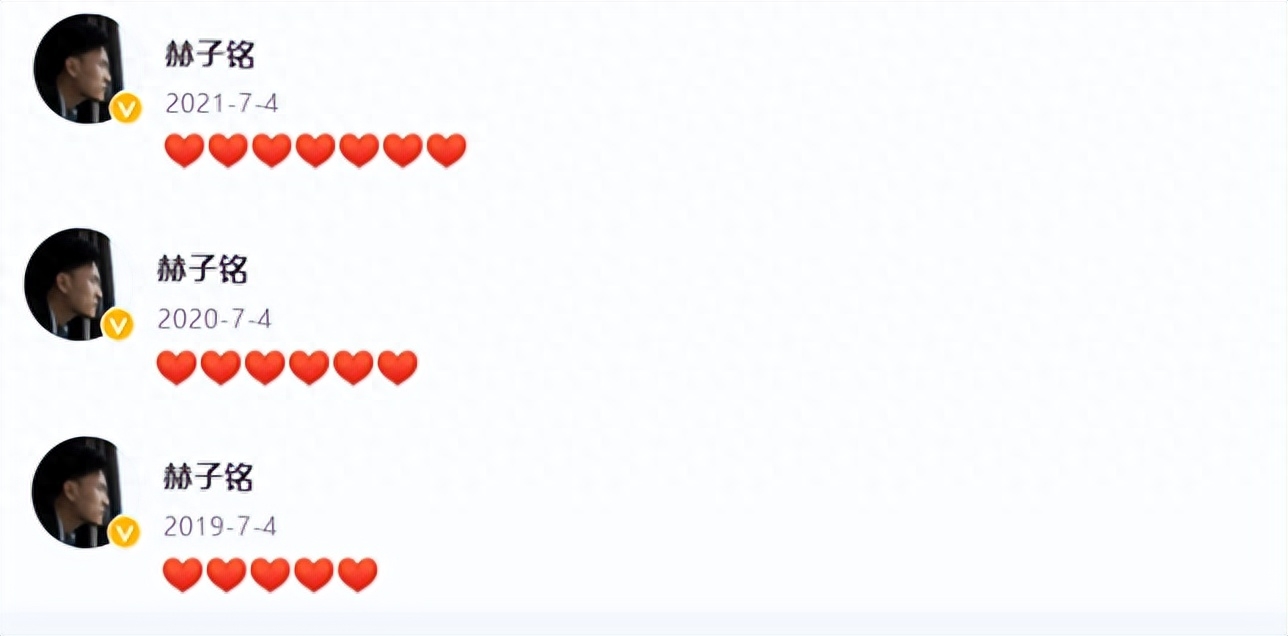 由于孩子判给了何洁抚养,赫子铭的生日祝福都没有合影可发,只能红心代表孩子的岁数。不知他是否像潘粤明一样,一年到头都难得见到孩子一面?