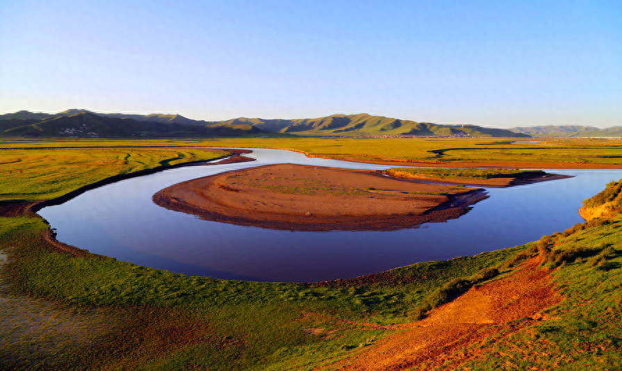 月亮湾将红原草原的美发挥得淋漓尽致。在一片开阔的草地上,白河呈“S”形蜿蜒流过,黄昏时,近处绿草茵茵,远处山峦叠黛,夕阳染红了天空,也染红了弯弯的流水,使草原显得格外的静谧。