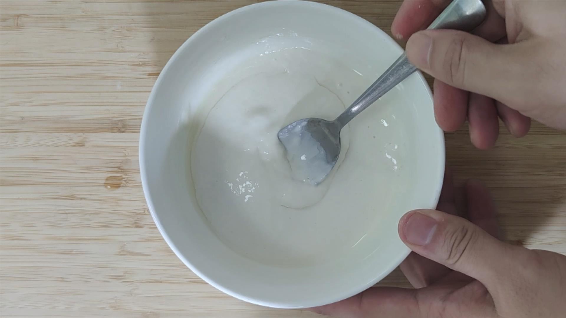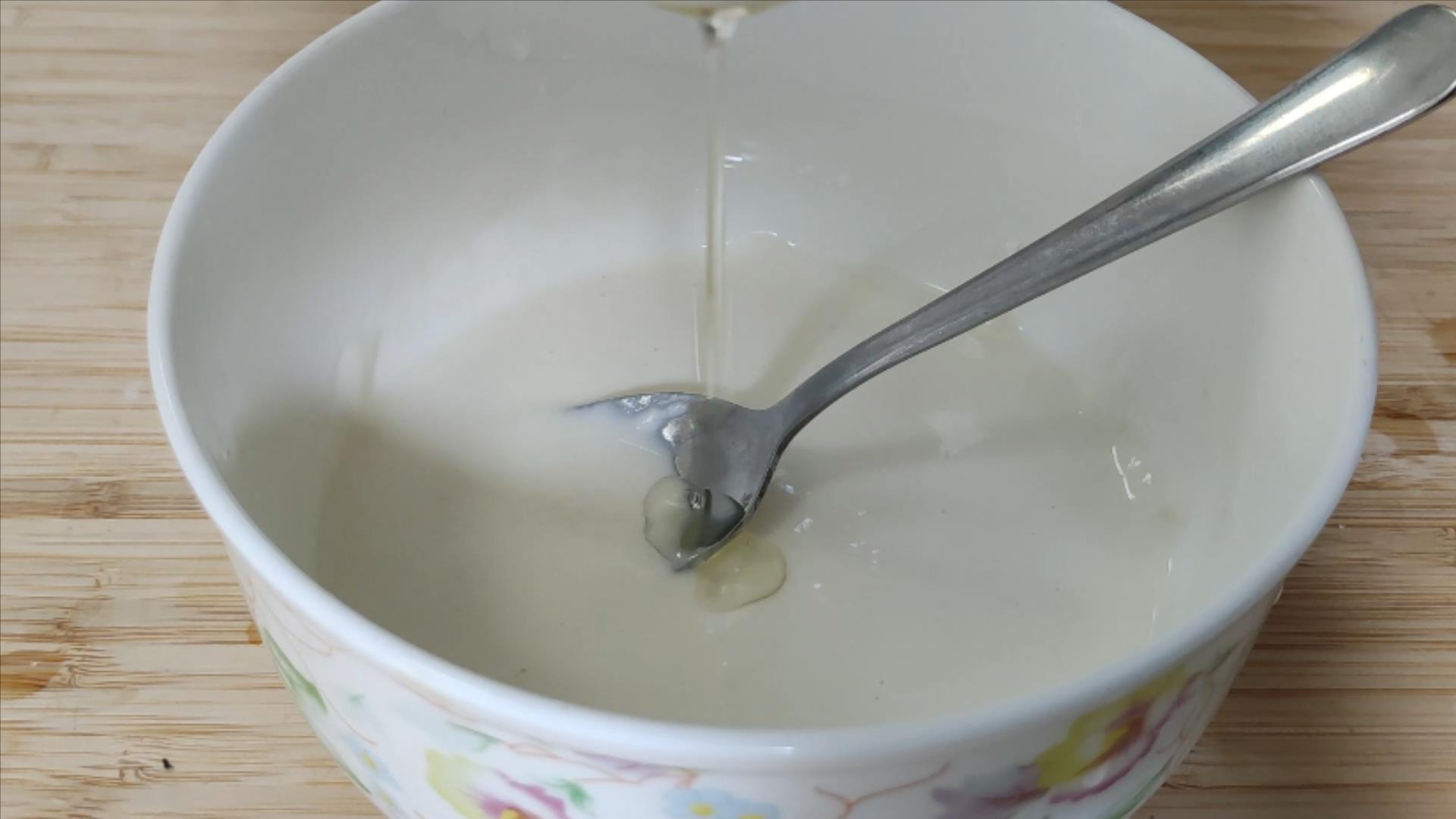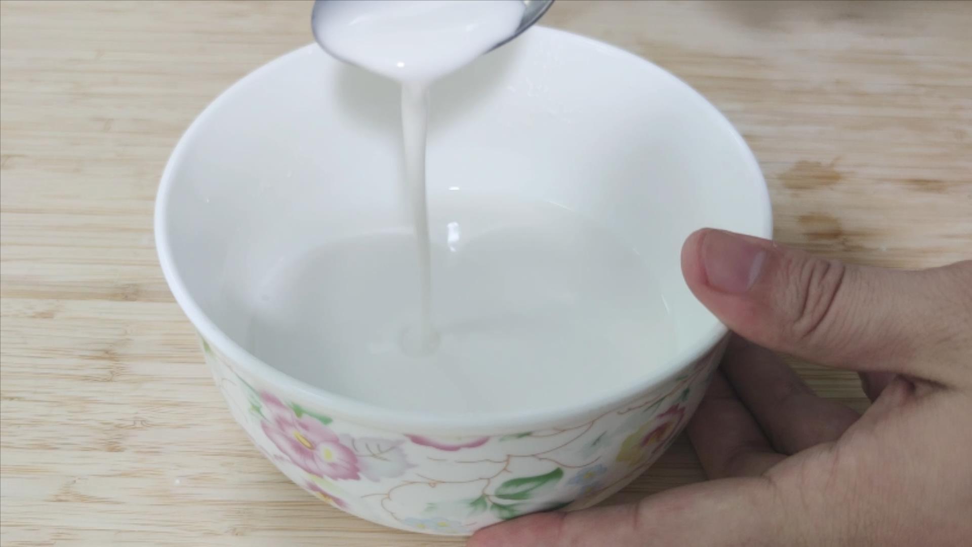 那么,我们怎么判断这个水粉糊调好了呢?用勺子添起来,自然下落,能够拉成一条直线,就表示可以了。