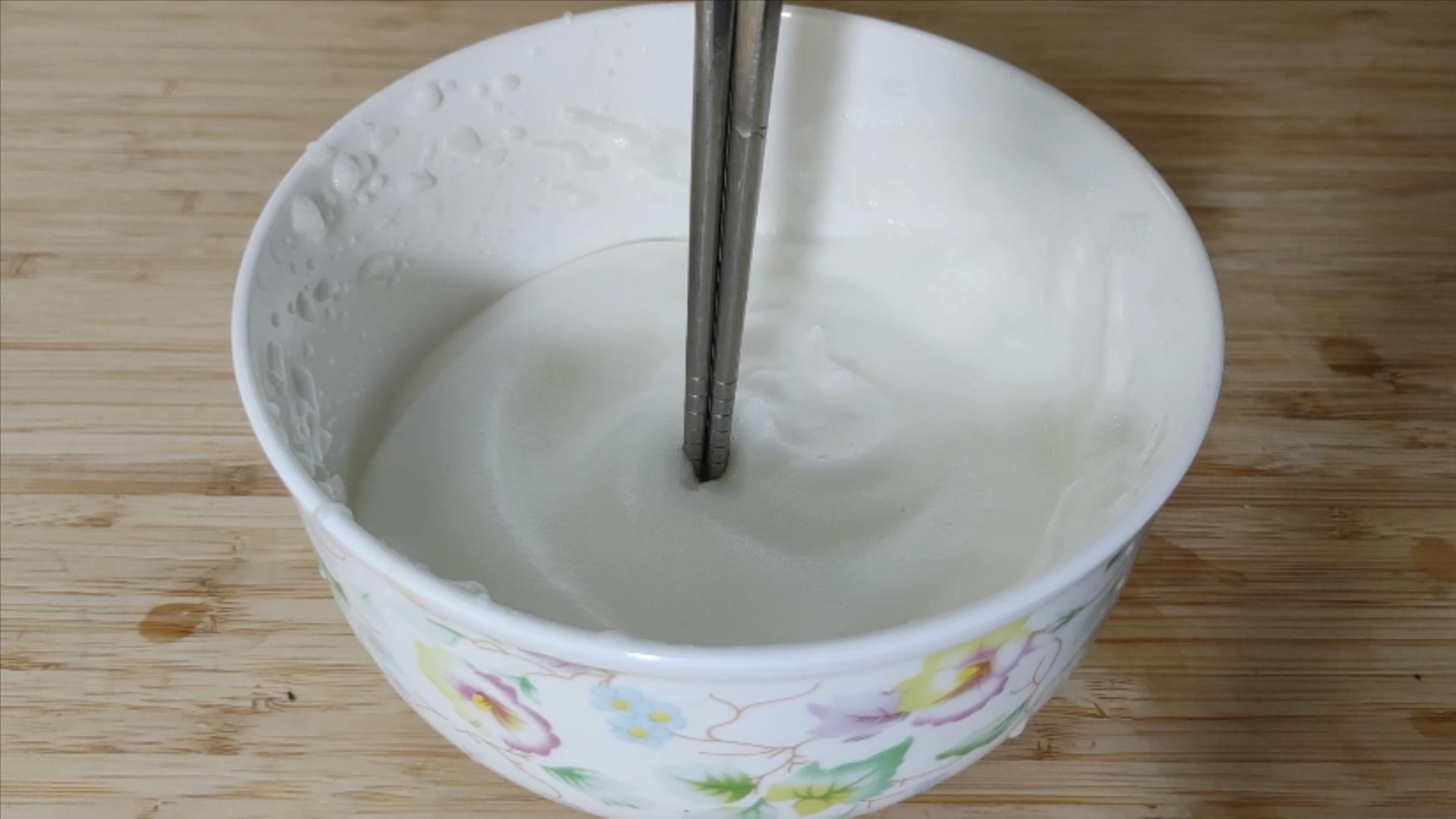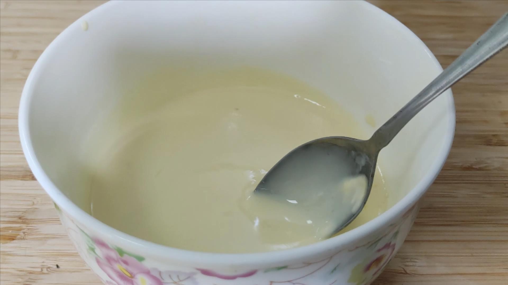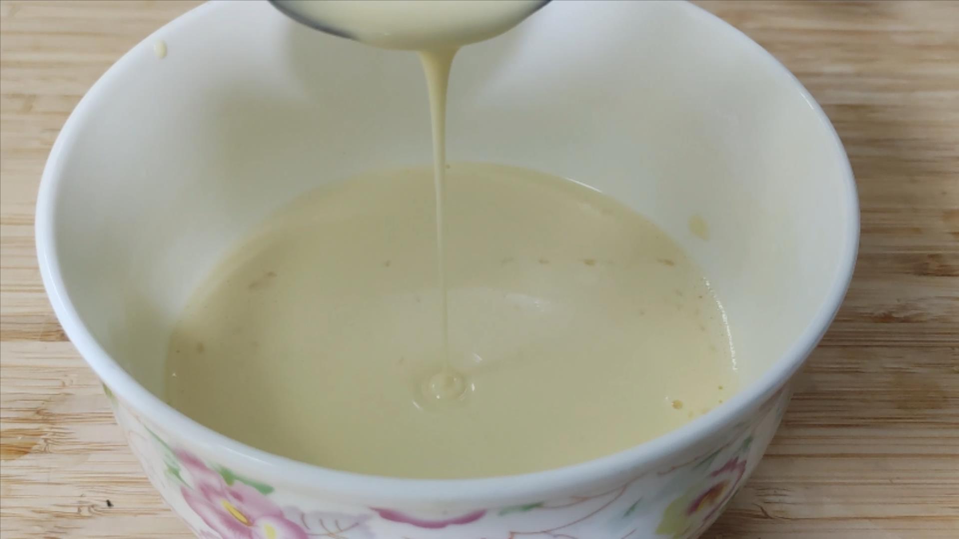 怎么判断这个全蛋糊调好了呢?用勺子添起来,自然下落,能够拉成一条直线,就表示可以了。
