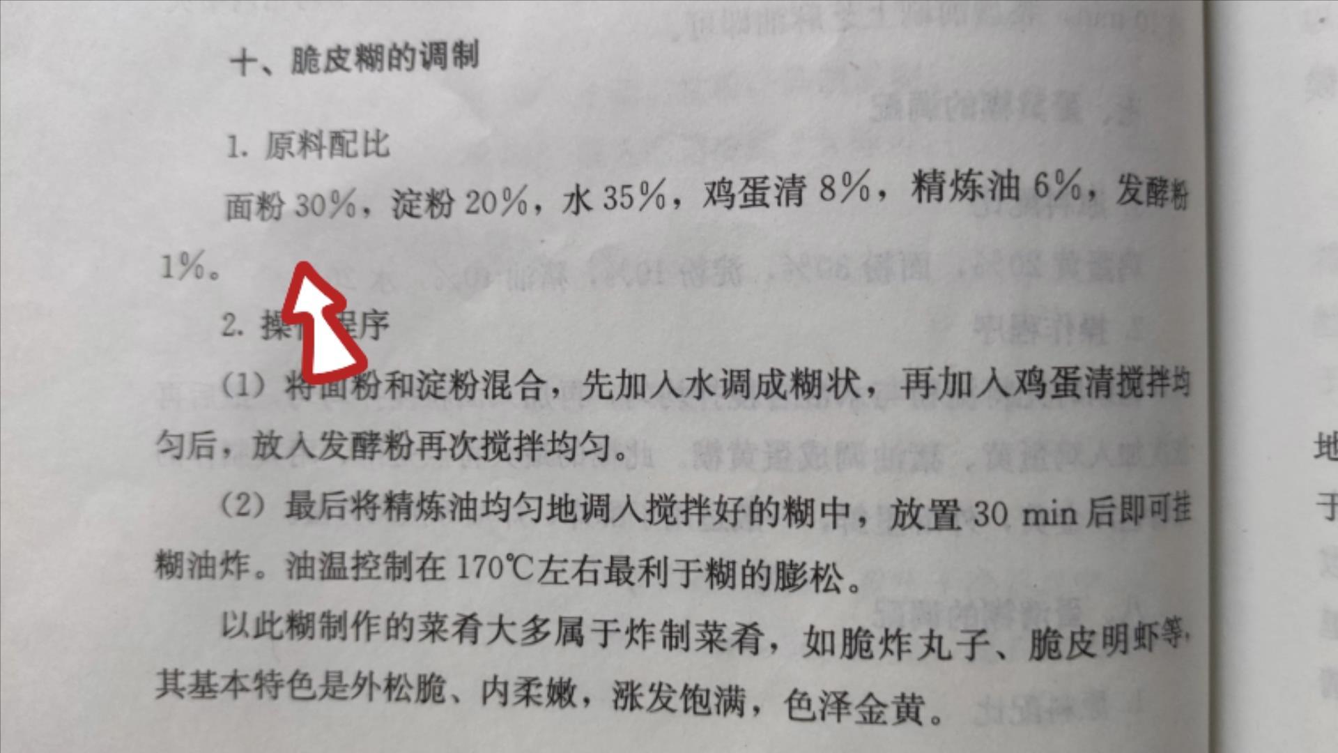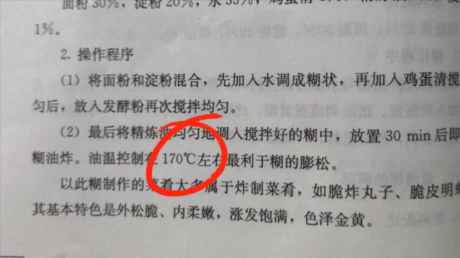 脆皮糊炸的时候,最适合的油温是多少呢?全蛋糊最佳油温为5成左右,170度左右最利于糊的蓬松,炸鸡、炸猪排也适用这个温度。这个教材上,已经写得非常清楚和明白。