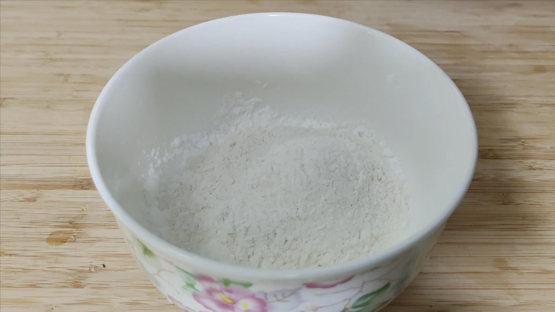 先取一个大碗,加入玉米淀粉30克,加入低筋面粉20克,加入35克水,用筷子充分搅拌均匀,在搅拌的时候尽量不要顺着一个方向搅拌,左3圈,右3圈的搅拌。