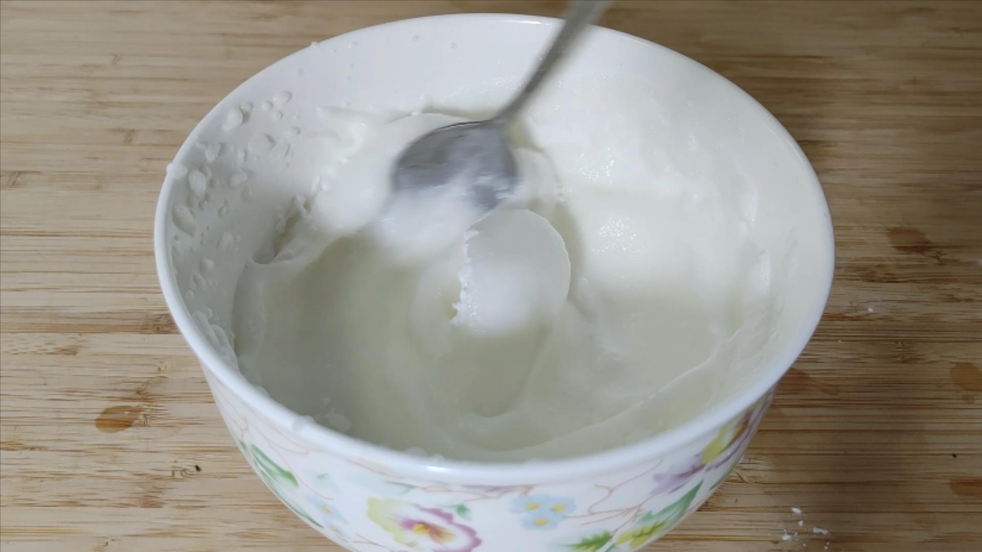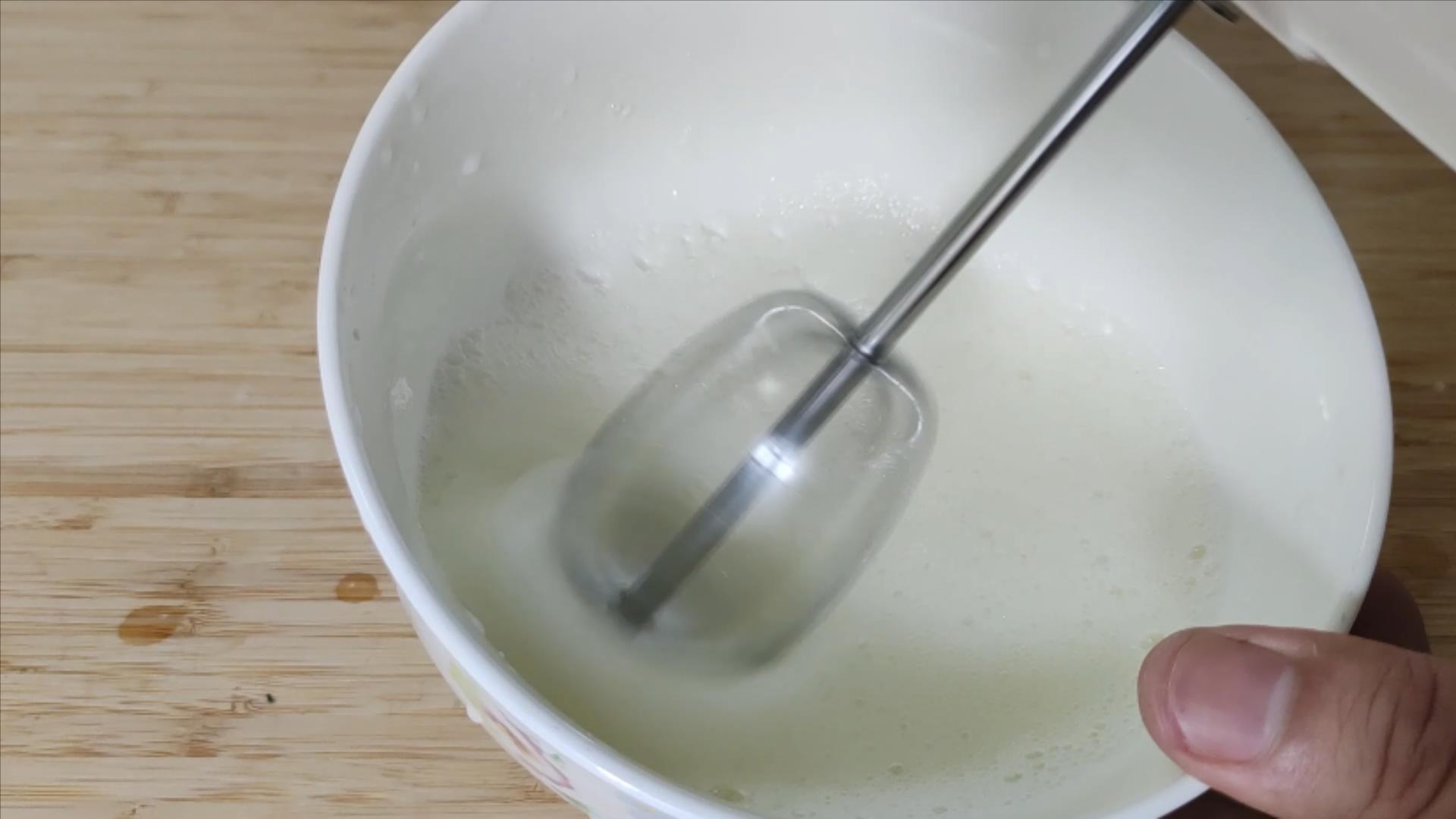 如果有电动打蛋器,那会轻松很多,顺着一个方向反复抽打蛋清,使蛋清变成细泡沫状,吸入大量空气。