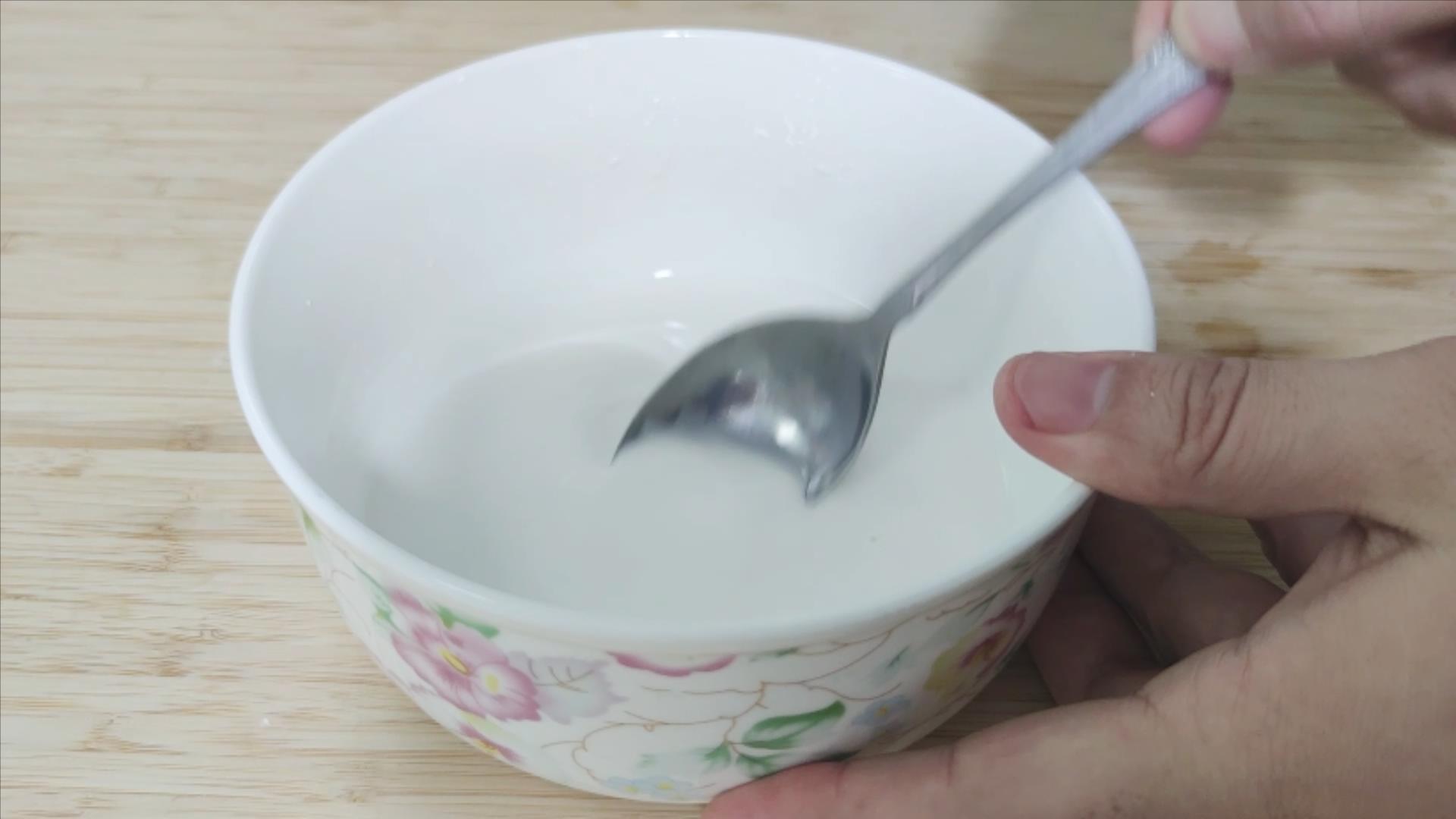 碗中放入55克土豆淀粉,加入45克左右的水,一般不加盐,但也可以加盐增加底味。然后不停的搅拌即可,只要加的不是面粉,都可以随意搅拌。因为面粉不是纯淀粉,如果朝一个方向搅拌,可以起面筋。小麦制作出的纯淀粉,是小麦淀粉,也叫澄粉。