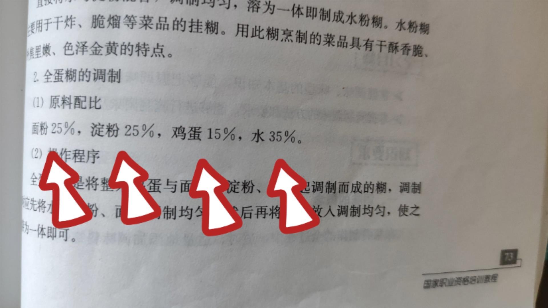 我们先看一下教科书上的标准答案,是怎么写的。面粉25%,淀粉25%,鸡蛋15%,水35%。