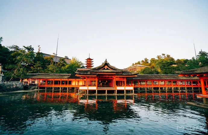 严岛神社以建在海上的神社建筑与鸟居而闻名,正对大鸟居就是红白相间的严岛神社,红柱、白壁的神殿与高山大海融为一体,以建在海上的神社建筑与鸟居而闻名。