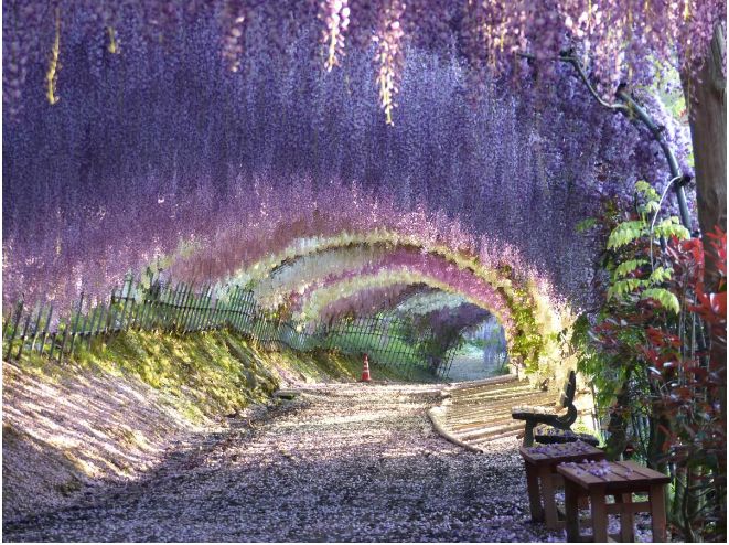 在每年的4月底,当紫藤花盛开时,这里就会举行一年一度的紫藤节。漫步于幽静的紫藤隧道中,周围覆盖着茂密的紫色花藤,静静地享受这片禅意般的宁静。
