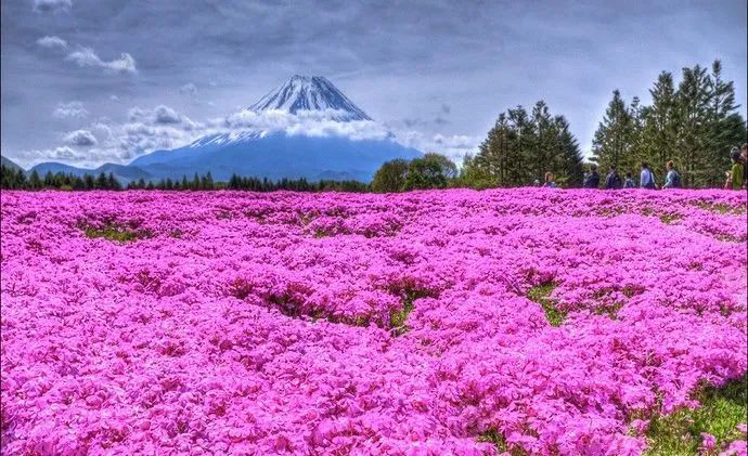 富士山芝樱节约有80万株樱花,彩色的芝樱如绒毯般铺陈开,与远处的蓝白色富士山遥相呼应,美不胜收,每年从四月中旬至五月底,前来赏樱的游人络绎不绝。