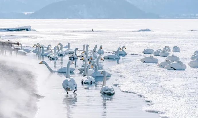 在这里,每年冬季都有300多只天鹅迁徙屈斜路湖。由于地热的缘故,即使大部分的水面仍处于结冰状态,但湖滨地区仍水流潺潺。