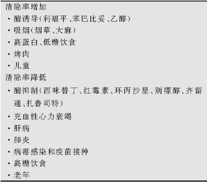 口服氨茶碱吸收良好,主要在肝脏灭活。副作用与药物血浆浓度有关;测量血浆氨茶碱浓度对确定正确的剂量是有帮助的。最常见的副作用是恶心、呕吐和头痛。磷酸二酯酶的抑制导致了这些副作用。也可出现多尿和心悸。高浓度时,由于腺苷A1受体的拮抗作用,可能出现心律失常、癫痫发作和死亡。茶碱的副作用与药物血浆浓度有关,且在血浆浓度低于10mg/L 时很少有副作用。茶碱在肝脏中被CYP450 代谢转化,因此,阻断CYP450的药物可提高茶碱的血浆浓度,如红霉素和别嘌醇。其他一些药物也可通过另外的机制减少茶碱的清除,从而提高它的血浆浓度(表3)。