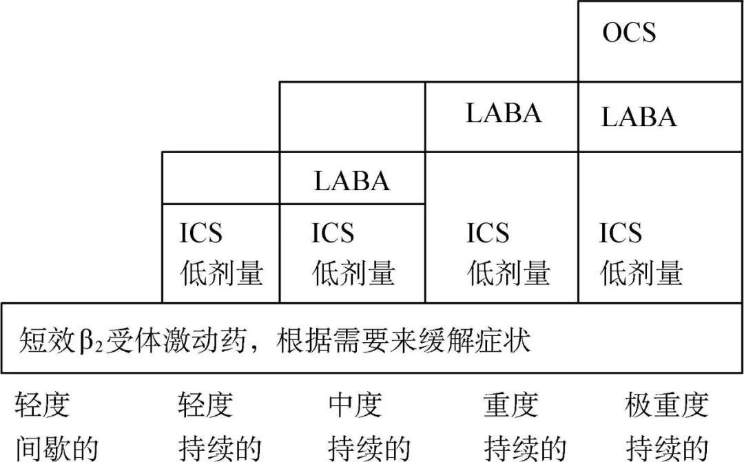 图2 根据哮喘的严重性和控制哮喘的能力阶梯治疗哮喘