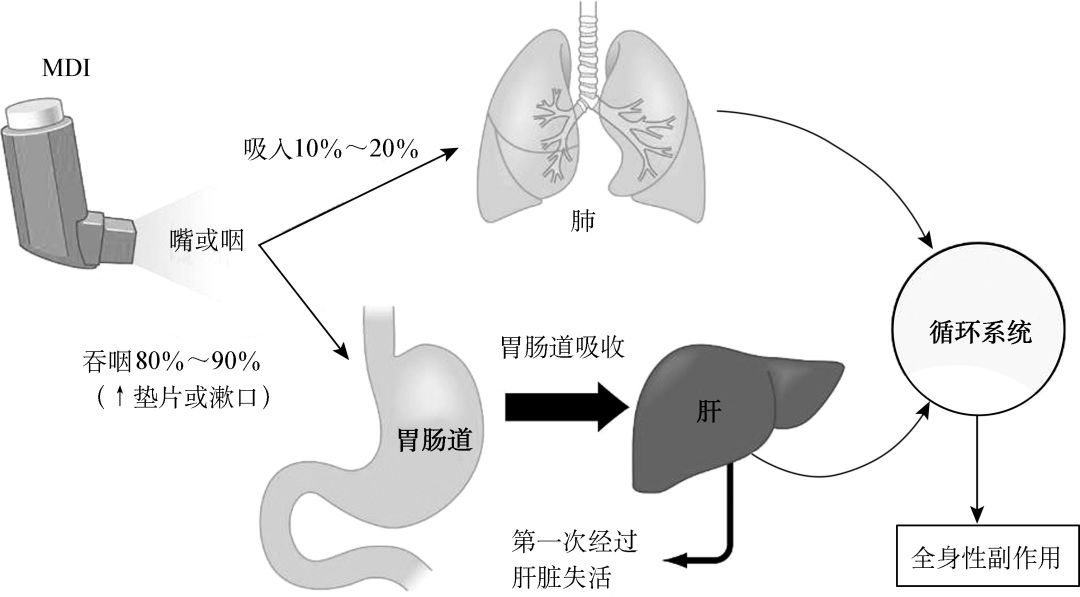 局部副作用包括嘶哑(发声困难)和口腔念珠菌病。大容积的吸入储物器装置明显减少了口腔念珠菌病的发病。曾担心ICS在肺内的吸收会出现全身性副作用,但许多研究表明吸入糖皮质激素全身性副作用不明显(图1)。推荐的最适剂量可能对血浆和尿的皮质醇浓度有一些抑制,但还没有确切的证据表明长期应用会影响儿童的生长发育和引起成人骨质疏松。事实上使用吸入型糖皮质激素能有效缩短所需口服糖皮质激素的疗程,从而减少糖皮质激素的全身副作用。