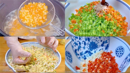 4、取出腌制好的苦瓜,先给苦瓜清洗一下,然后再给苦瓜放进锅中焯水,焯水断生后 接着再给捞出控水备用 锅中水再次烧热 放入土豆萝卜丁焯水,焯水断生后 继续给捞出控水