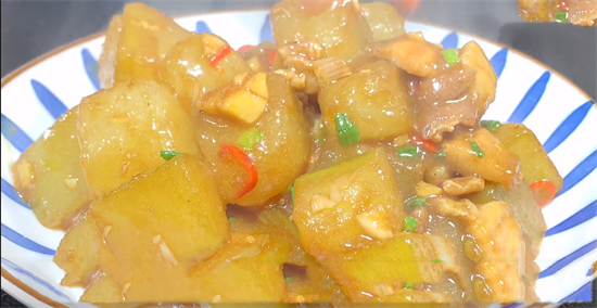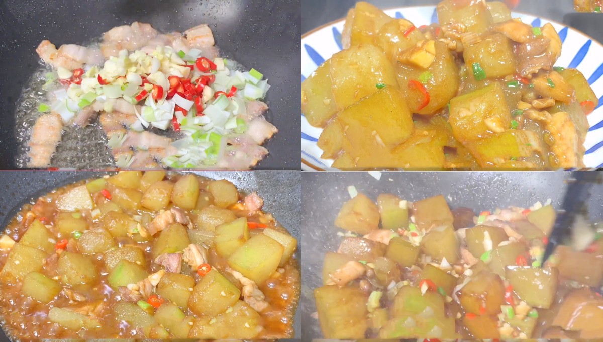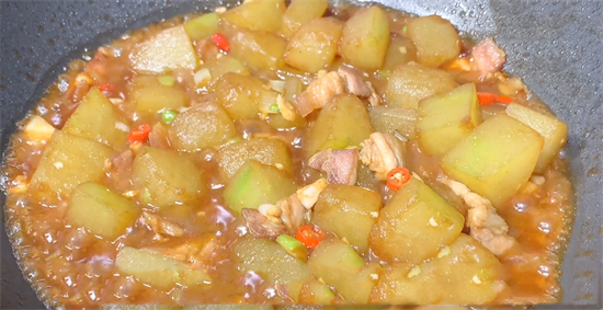 8、接下来起锅烧油 放入五花肉片翻炒一炒,小火慢炒,煸炒出里面的油脂,再继续炒,炒到微微焦黄的时候 接着再放入葱姜蒜爆香,接下来再放入冬瓜继续炒,翻炒均匀,把弄好的料汁倒进去 继续小火炖,炖到入味的时候 再被盛入盘中 美味好吃的红烧冬瓜就做好了、