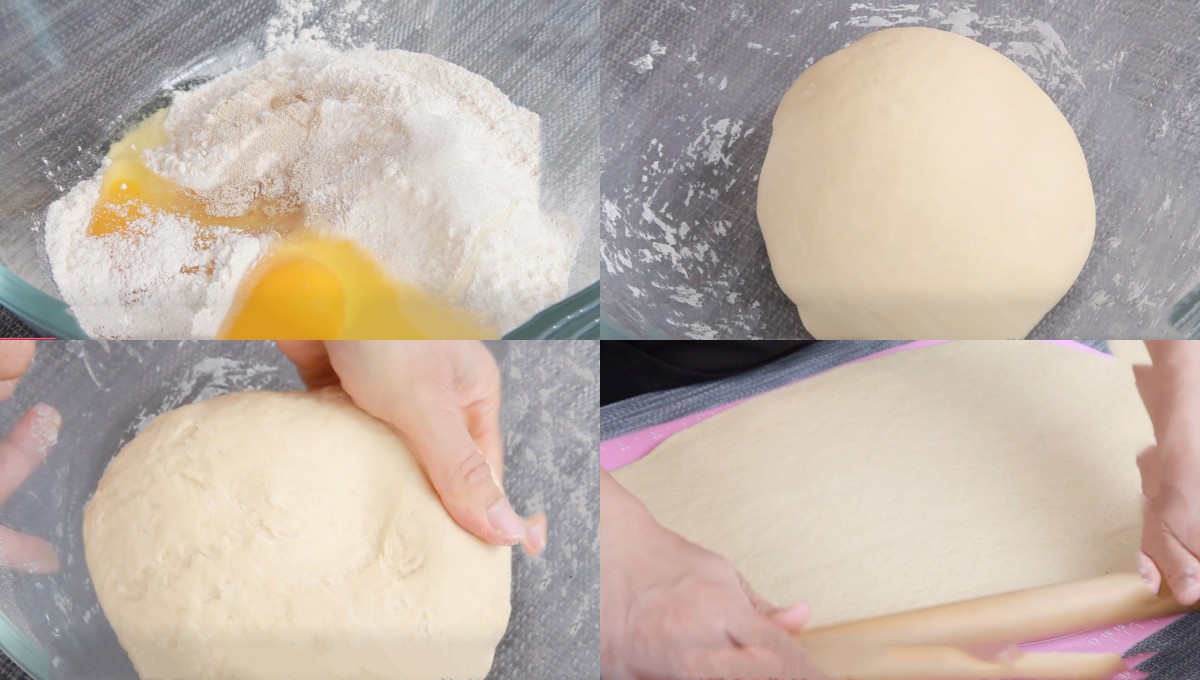 4、面团发酵好取出,揉面排气,接着再把面团给揉圆按扁,再给擀成掰一点的面片,不要给弄得太薄了,不然会影响二次发酵,