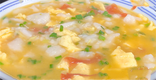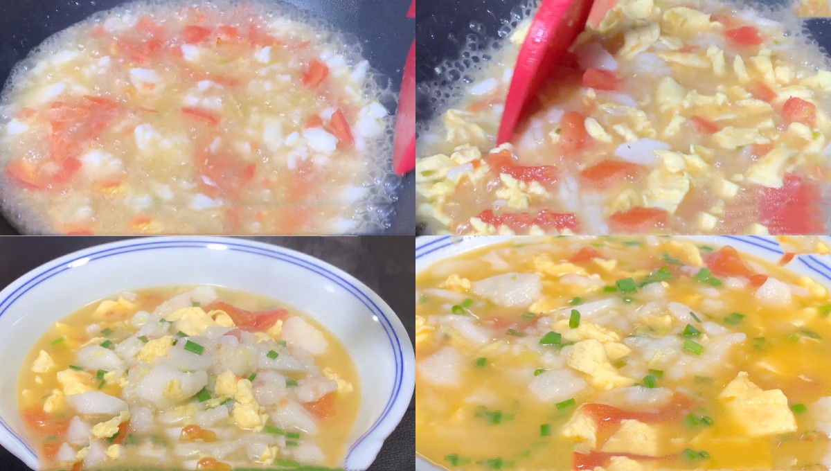 7、西红柿炒到软烂的时候 再倒入开水 大火给煮开 再把山药碎给添加进来,接着再添加盐 鸡精 胡椒粉 生抽 调味 然后接着再放入鸡蛋碎 继续给煮入味