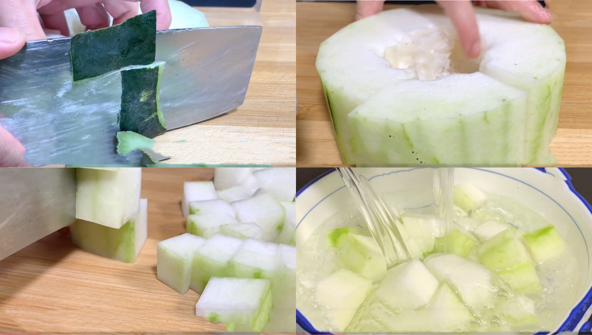 1、准备一些新鲜的冬瓜,先给冬瓜清洗一下,再把冬瓜瓤给弄下来,接着再给冬瓜片切下来,给冬瓜清洗一下,接着再给冬瓜切成冬瓜块,切成大小均匀的冬瓜块就可以了