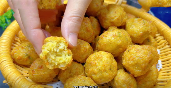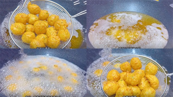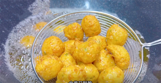 6、丸子炸到焦黄酥脆的时候 给盛出来,如果想吃更加酥脆一点的,油温给升高,然后再继续复炸,炸到焦黄酥脆 给盛出 美味好吃的莲藕丸子就做好了、