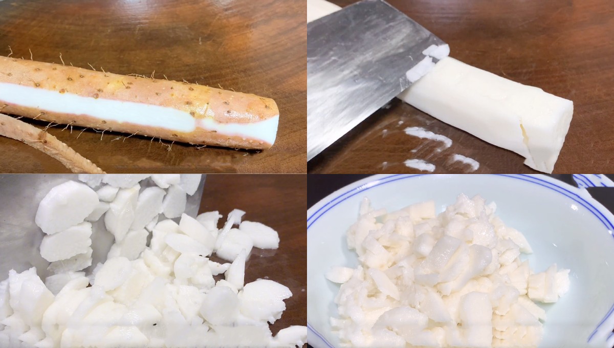 1、准备一根新鲜的山药,先给山药清洗一下,接着再给山药削皮,然后再给山药拍碎,再给切一下,弄好的山药碎 把碗把它放进碗中备用