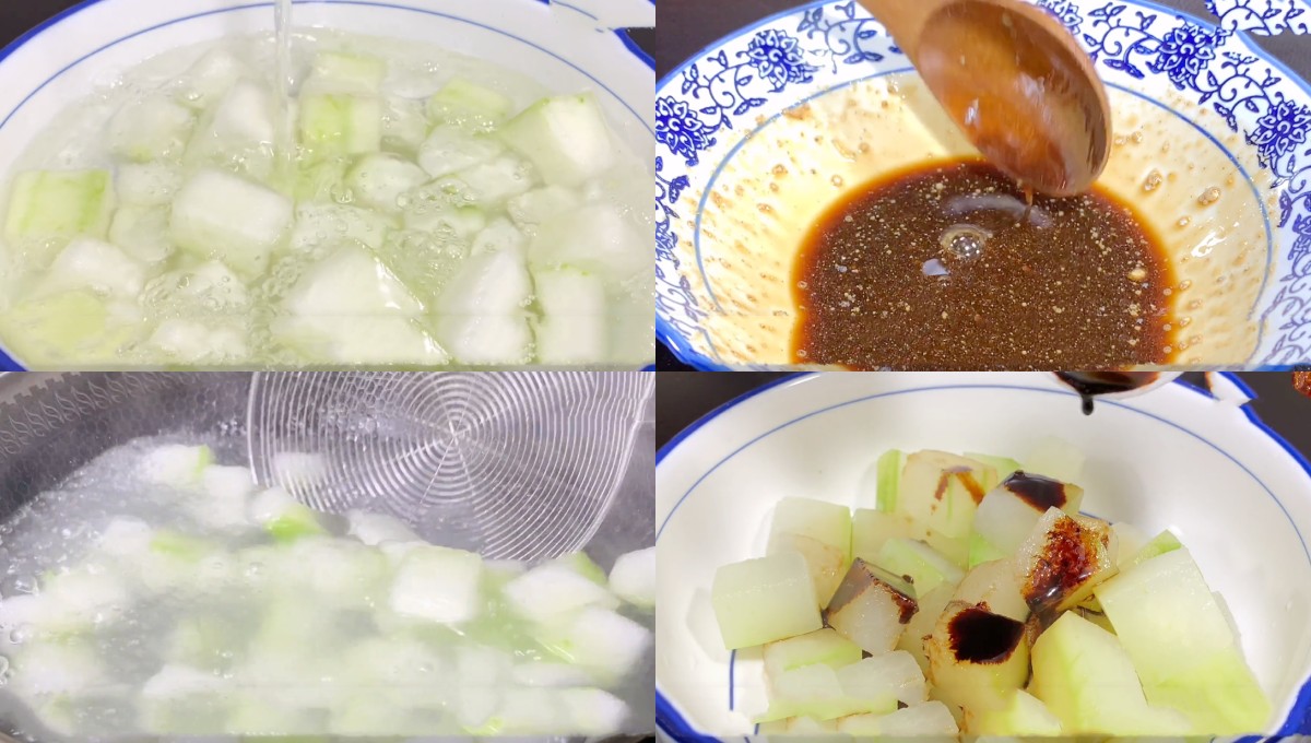 7、接下来锅中烧水,水开再放入冬瓜焯水,焯水断生后 再给捞出控水备用。接下来再往冬瓜里面添加一些生抽 老抽充分地搅拌均匀 使其上色