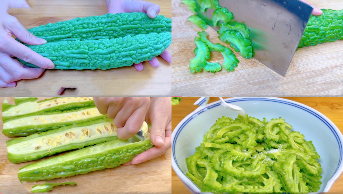 1、准备几个新鲜的苦瓜,先把苦瓜给清洗一下,接着再把苦瓜给切开,把里面的苦瓜瓤给挖出来,接着再把苦瓜给切成薄一点的苦瓜片,