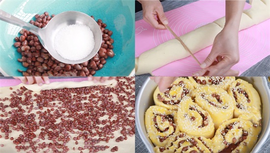 5、接下来取出红豆 添加红豆 再给充分的搅拌均匀,接着再把红豆给放进面片上,整理平整,然后再给卷起来,边卷边按压,这样卷得紧实一些 再切成大小均匀 大小剂子