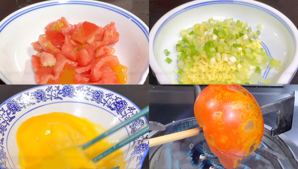 2、接下来再准备西红柿,先把西红柿给扎到叉子上,然后再放在火上给烧一烧,然后再把西红柿的外皮给撕下来。接着再给西红柿清洗一下 然后再给切成西红柿碎 切好的西红柿碎 再给放进碗中备用