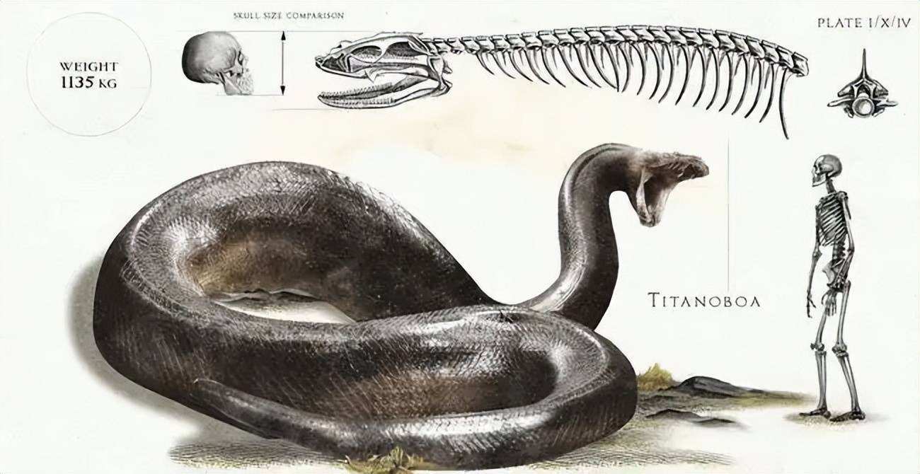 泰坦巨蟒,长14米,宽80厘米,重1.5吨,它的外形就类似于现在的蛇类放大后的样子,但它具备了现在蛇类所不具备的咬合力和绞力。