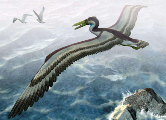 桑氏伪齿鸟,属于伪齿鸟科,是一种史前巨鸟,它的双翼展开之后的长度可以达到7米,但是它的肩胛骨却非常的小,所以呢,桑氏伪齿鸟要想更快的飞行,通常是需要借助风力来完成。