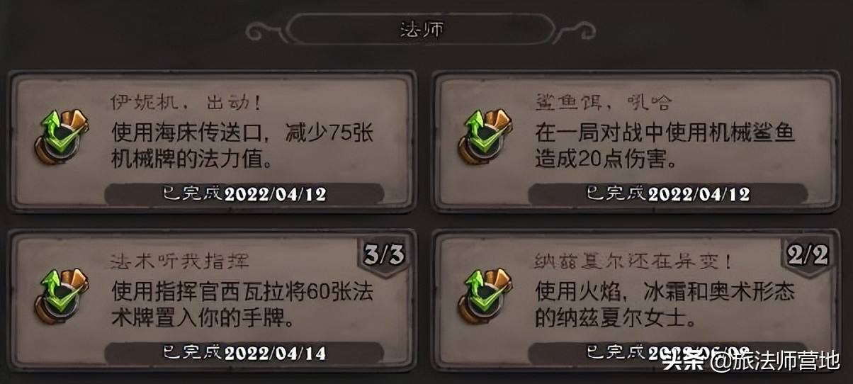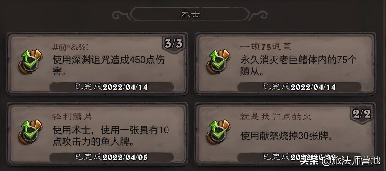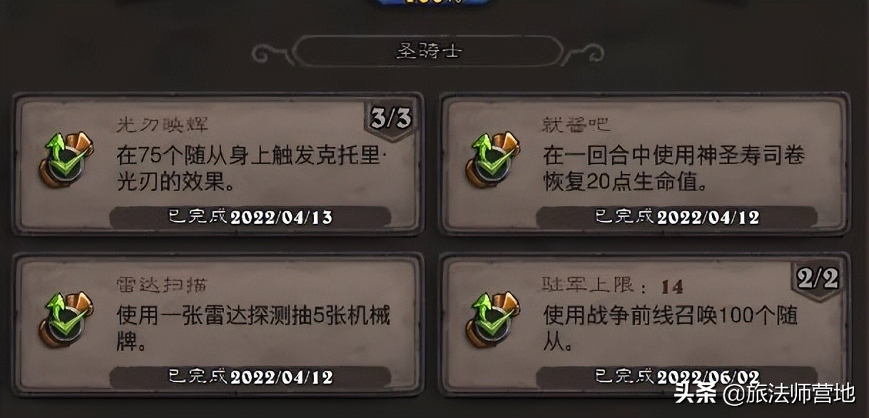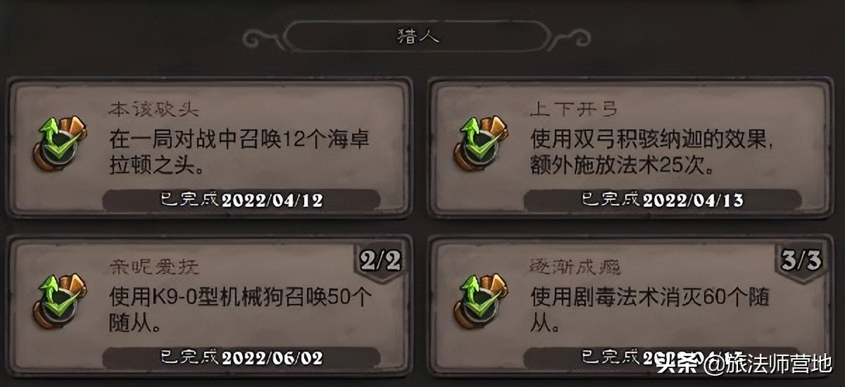 1成就的奖励就是蚊子腿,最高的500经验换算成后面1500经验50金,也就17金。所以为了这点钱不要太纠结,心情好就刷会,心情不好了就果断放弃。毕竟炉石可是专治低血压的神药,大家还是身体要紧。比如这次我的标题快人一步,但即使你们像作者我一样完成了如此多新版本成就,加起来的奖励经验还不如每个星期的每周任务的经验呢。