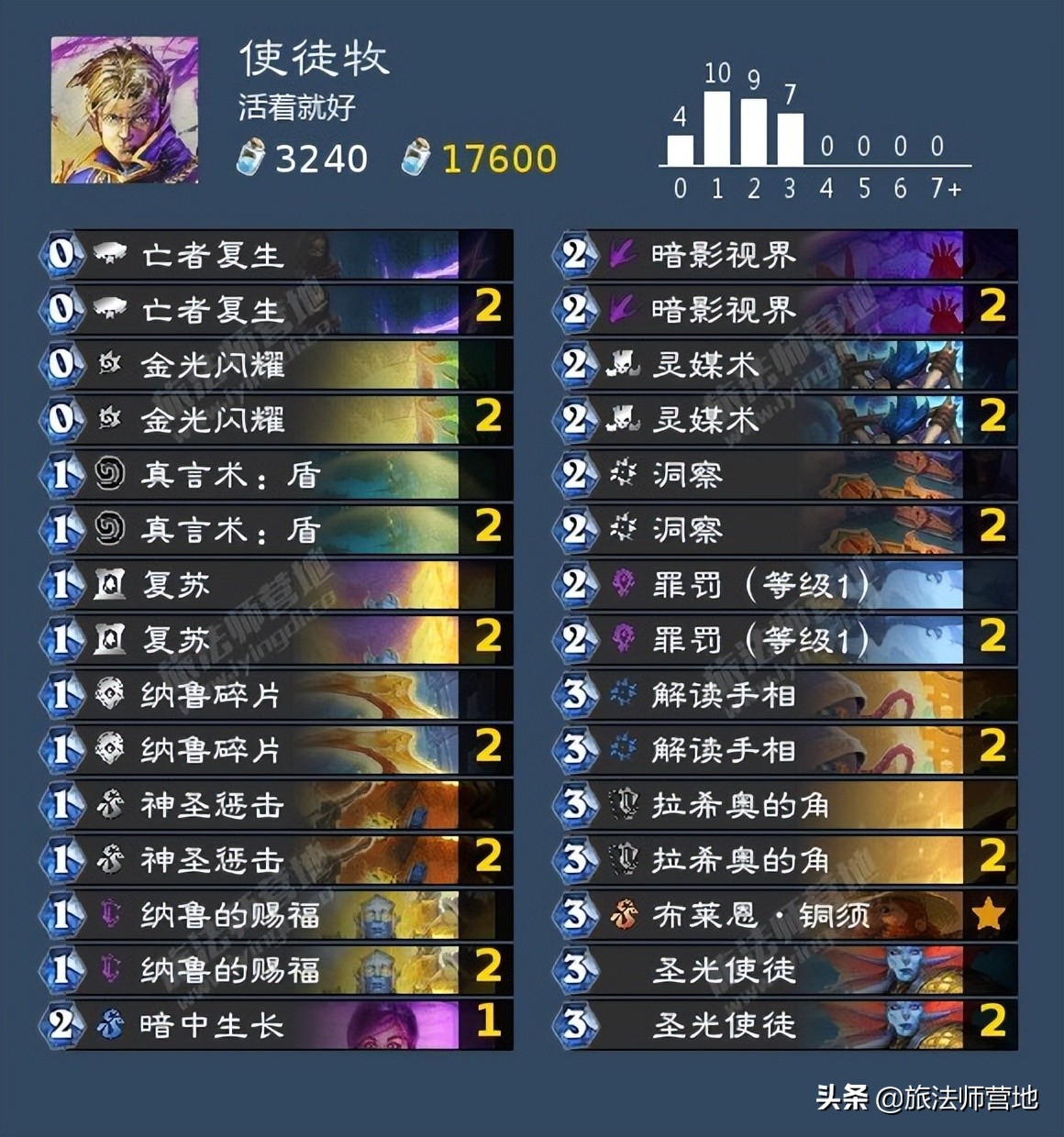 攻略就是起手找随从还有检索随从的法术。尽可能用1张神圣法术触发更多的圣光使徒,配合铜须做起来还是很快的。亡者复生和灵媒术复制圣光使徒用的。其实可以带上1张咖啡师,这样可以回收更多的圣光使徒。