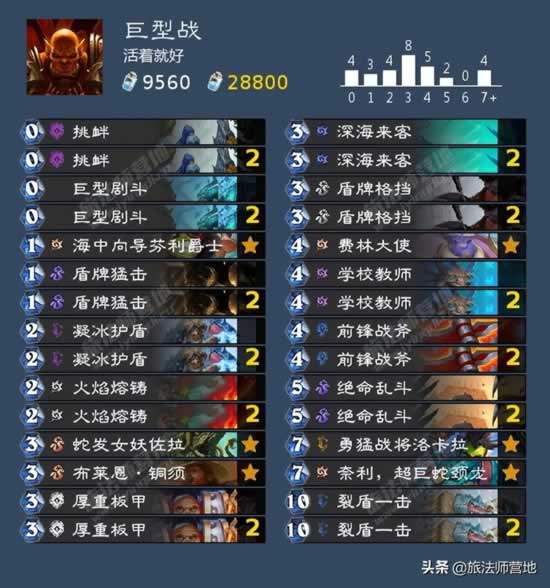 放出海怪!使用战士,使用10张其他职业的巨型随从。累积型成就,用新卡巨型剧斗还有费林大使就好了。可惜现在多了2个中立巨型,不然就算白给型成就,一般3把搞定。卡组就用冲锋战改下就好了,把斩杀组件换成巨型组件。