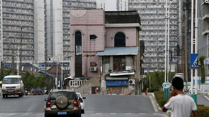可是路中间却矗立着张新国一家的房子,柏油路也在经过张新国家时,由原来的四条车道变成了两条车道。