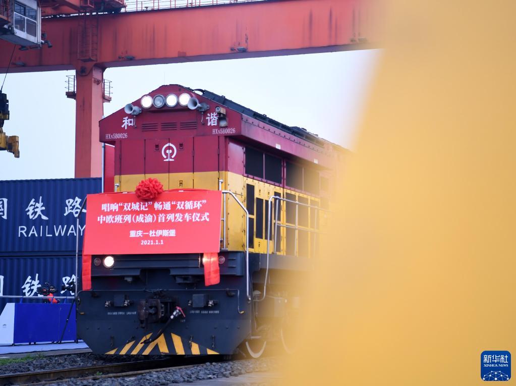 2021年1月1日,中欧班列(成渝)号首列班车在重庆团结村站等待发车。新华社记者唐奕 摄