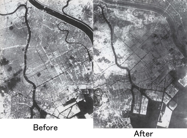 1945年2月25日,174架“超级堡垒”小试牛刀,夜间轰炸了东京。这次轰炸还是保持了较高的投弹高度,精度并不理想,炸弹的携带量也限。但总计450吨燃烧弹焚毁了东京1平方英里——部分资料简单换算成1.6平方公里,事实上应该是2.59平方公里,2万8千栋建筑被烧掉,充分证明了火攻战术的有效性!受此鼓舞,李梅在半个月后组织了本文开始描述的这次行动,这次彻底贯彻了李梅的所有战术安排,“超级堡垒”的架数只增加了不到1倍(从174增加到334),但总载弹量增加到2000吨,是上一次的4倍还多!累积起来的毁伤效果加成非常惊人——烧毁的面积足足增加到了16倍!