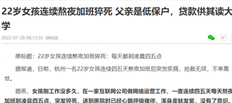 2022年,在杭州一家互联网公司做网络运营的22岁女孩儿,在连续四五天熬夜加班后突发猝死,送医院最终抢救无效。