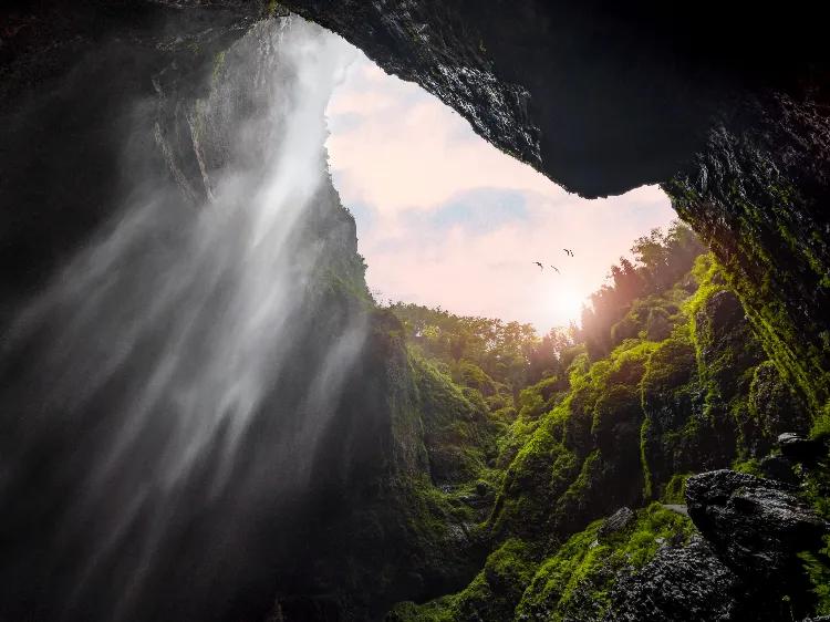硝洞岩,位于四川省乐山市沙湾区,是一个巨大的自然天坑,以前是用来采硝石的地方,因此得名硝洞。从上绵延而下的溪水,在空中分散开来,形成水雾,在阳光的照耀下,得以见到彩虹。