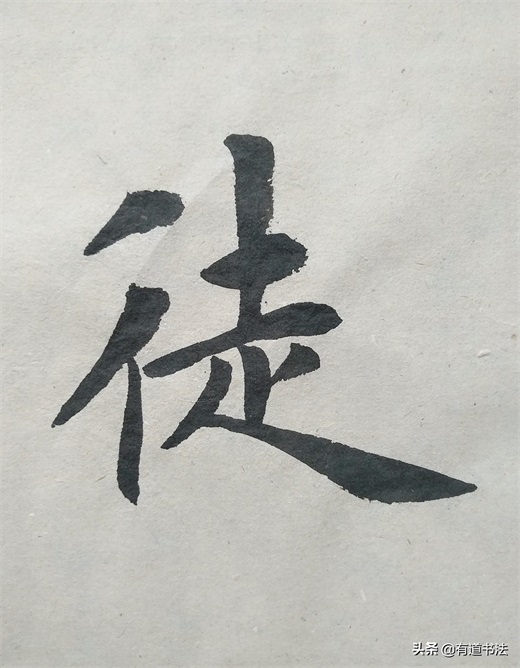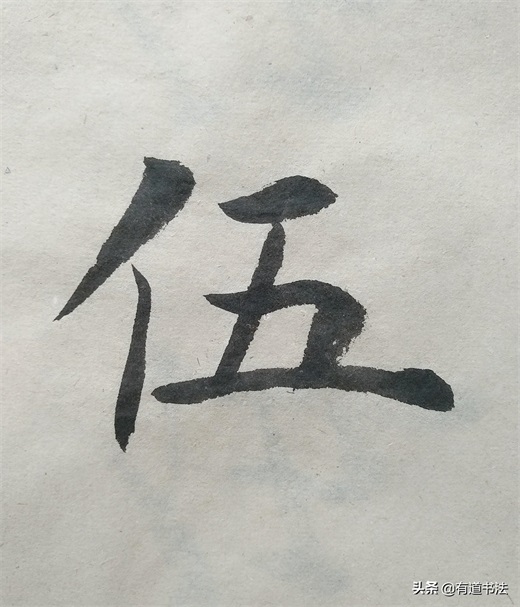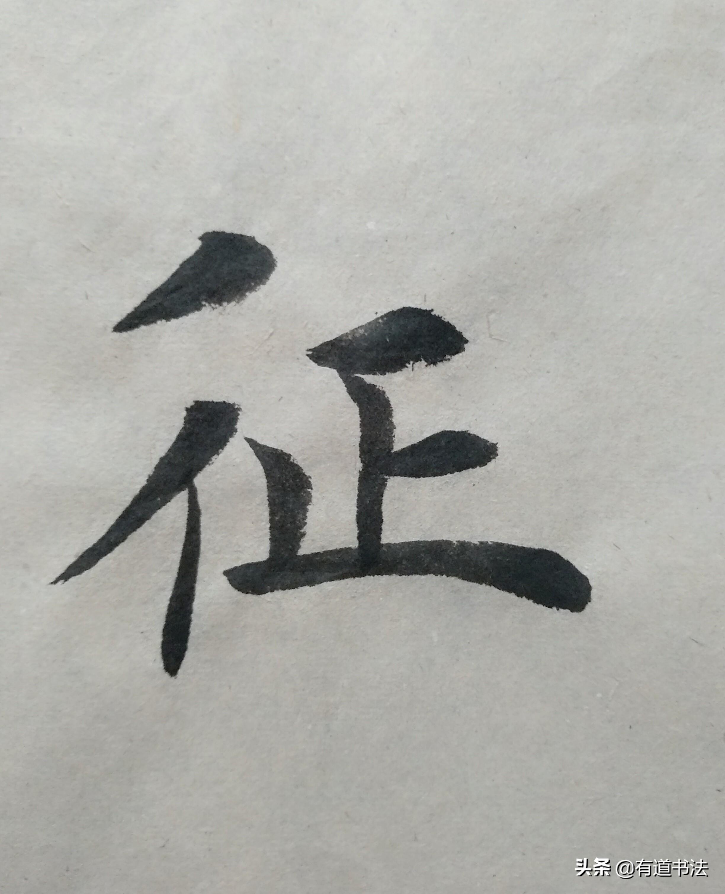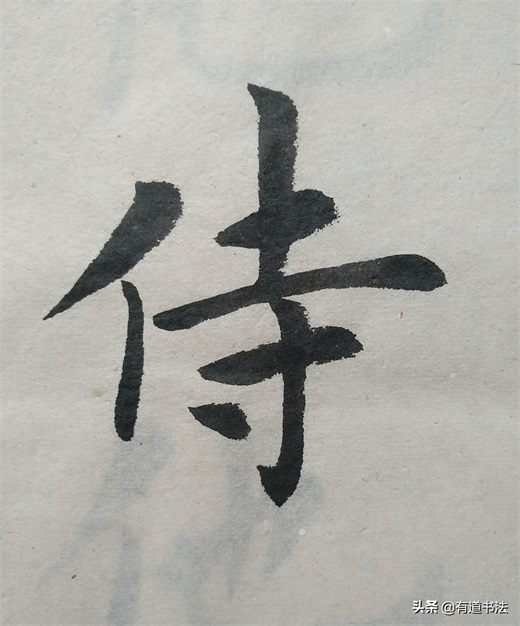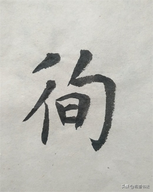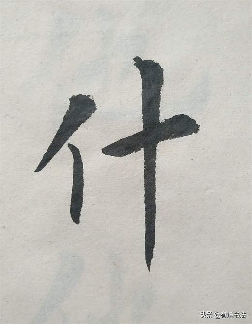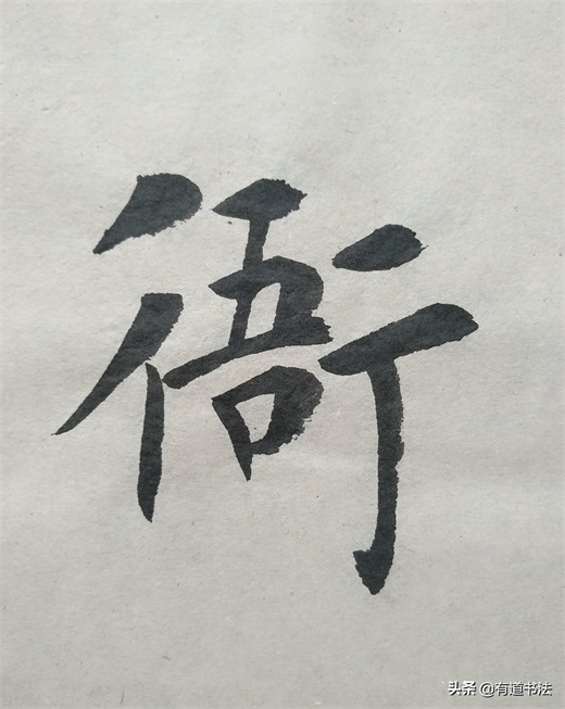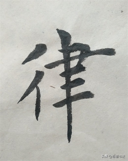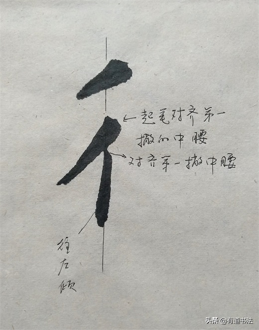 第一个短撇书写的时候注意角度,不可以写平撇,也不能写的太过倾斜,往左下方撇出才合适。第二个撇稍长,起笔在上边短撇的中腰,最后竖画与第一个撇的中腰对齐在一条垂线上。如此书写,双人旁才稳定,不过单人旁永远写垂露,并且要稍稍左倾,也就是说竖画只要在字的左侧,都要写垂露。