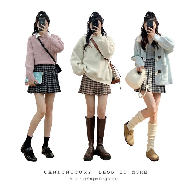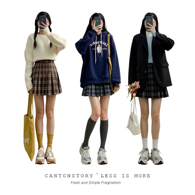 同时,在风格上,短裙+厚底鞋的搭配也更符合小个子女生的元气感和灵动感。再配上一双黑色小腿袜,还能起到修饰小腿赘肉的作用,显瘦显腿直妥妥的!