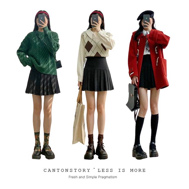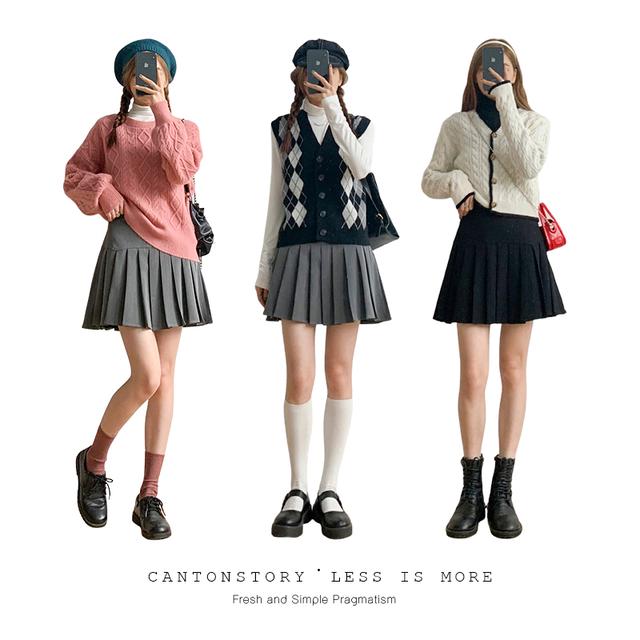 今年,菱格毛衣的热度一直是只增不减,此时我们就可以pick一款带有菱格元素的毛衣先来试试水。带有菱格花纹的毛衣马甲,搭配上修身打底衫+百褶短裙+白色小腿袜,颇有几分元气少女感,再pick一顶贝雷帽,复古感满满,一跃成为日系女孩。