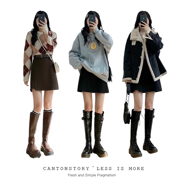 此时,我们最好是塑造出一条明显的高腰线,配合中筒靴的厚底或高跟设计,很显腿长。而且,短裙和中筒靴的颜色最为一致,才会让造型显得更协调更耐看。