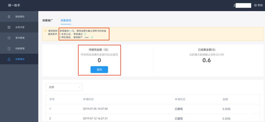 我要赚钱是【微一助手】提供给用户的一个赚钱功能,用户可自主选择开通,开通后,根据用户建立的商品推送,微一助手向用户结算每条商品的推送佣金,并支持提现到个人账户。