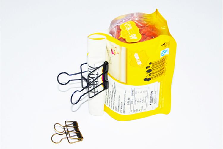 妙用一:巧用长尾夹做防潮神器。家里吃不完的零食怕受潮?只需要将零食包装袋向内多折几次,再用长尾夹一夹就能起到防潮的妙用了。包括盐袋子、薯片袋等都是可以使用的。