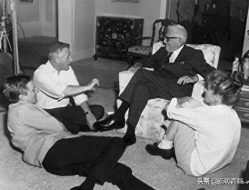 电影《猜猜谁来吃晚餐Guess Who's Coming to Dinner》(1967)的导演斯坦利·克雷默Stanley Kramer(左二)和编剧威廉·罗斯 William Rose(左躺地上者)在斯宾塞·屈赛Spencer Tracy(右二坐沙发者)和凯瑟琳·赫本Katharine Hepburn(右)的家中交谈