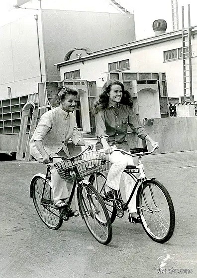 凯瑟琳·赫本Katharine Hepburn(左)与侄女凯瑟琳·霍顿Katharine Houghton(右)在拍电影《猜猜谁来吃晚餐Guess Who's Coming to Dinner》(1967)期间,工作之余在片场周围以骑自行车为乐