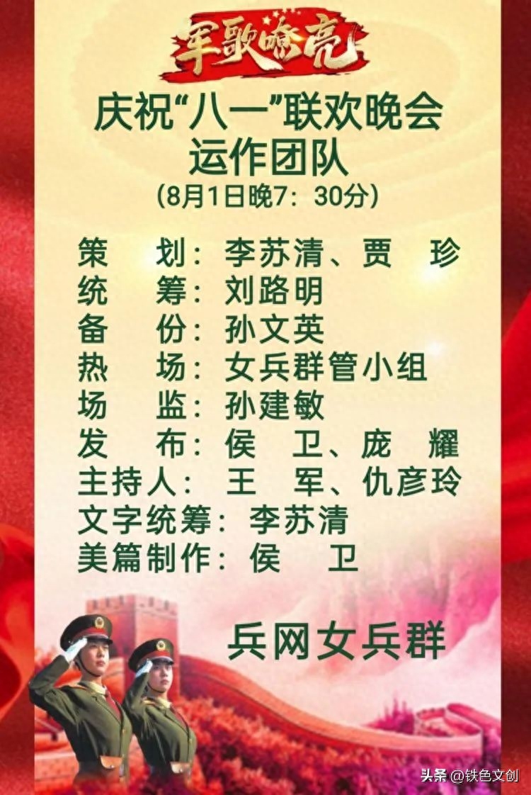 今夜军歌嘹亮,今夜星光灿烂,今夜梦回牵绕,今夜浮想联翩。每年的“八一”建军节,我们都会集合在火红的军旗下,唱响那些让我们永远难忘的军歌,歌里有我们激情燃烧的岁月,有我们永远难忘的军旅情怀。让那伴随我们成长的军歌,又带我们回到那绿色的军营,镌刻在我们依然不散的军魂里。感谢今晚所有积极参与晚会的战友们,同时也感谢因节目形式限制,未能如愿参演的姐妹们,是你们让今年的“八一”建军节,过得不同凡响和更加有意义。感谢管理团队的战友们,是你们的无私奉献,才有了今晚这样一个隆重热烈欢庆的平台,尽情展示我们的激情和才艺。让我们一起在这个第二军营里,愉快的度过每一天,不断的充实和完善自己,让健康和快乐伴随我们一起分享金色的夕阳。