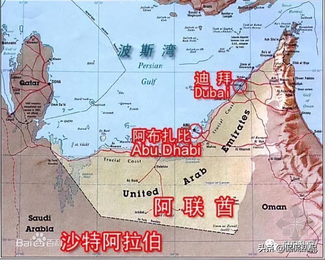看到卡塔尔右下方的那个UAE了没?UAE 是The United Arab Emirates的缩写,就是阿拉伯联合酋长国,又译作“阿拉伯联合大公国”,其首都为阿布扎比,不是迪拜哦!
