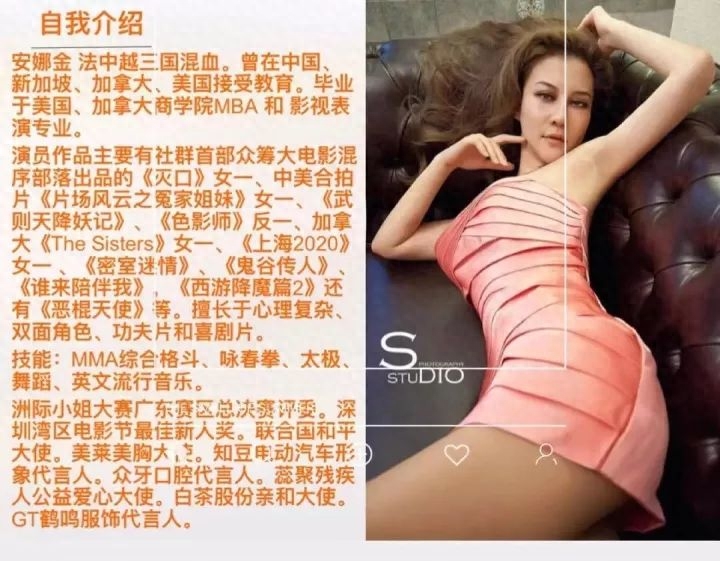 什么「美国纽约影视表演学院」、「加拿大温哥华影视表演」、「电臀天后」、「魔鬼身材天使脸孔」、「性感女神」一股脑儿往资料上盖,简直是玛丽苏之光「九亿少男的梦」,安娜金女士这个资料怕不是自己写的吧?