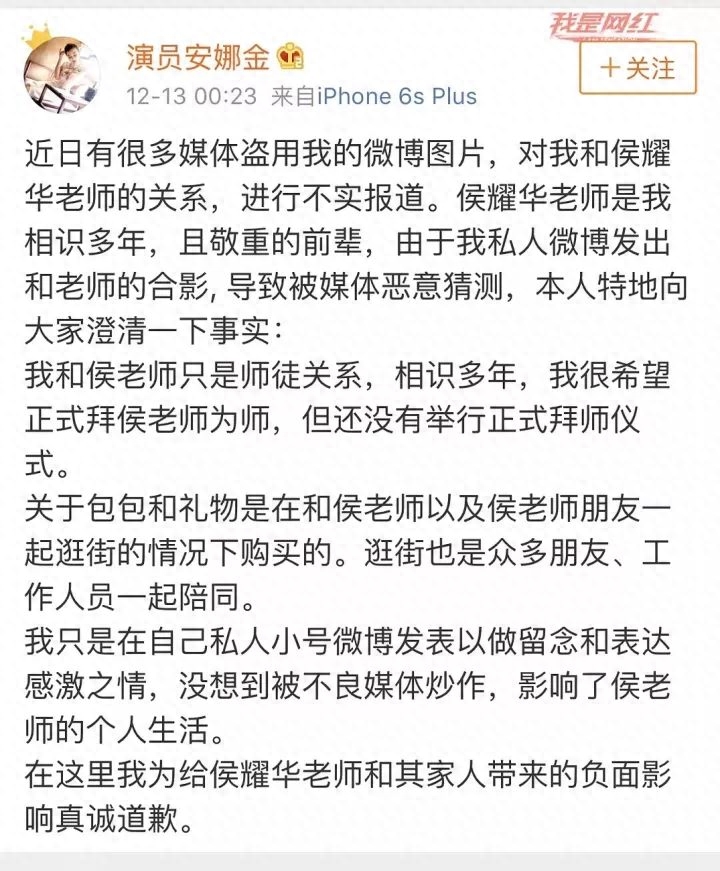 凌晨,安娜金发表了新微博并置顶,斥责「不良媒体炒作」,竭力维护自己和师父的关系,还表示自己和侯耀华「还没有举行正式拜师仪式」。