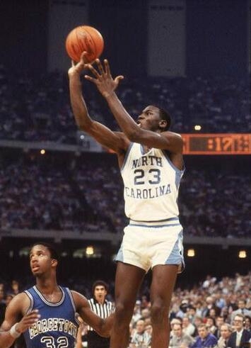 1982年3月29日,乔丹作为北卡罗莱那大学的一名新生,在NCAA联赛的决赛里投进制胜球,帮助北卡大学队以63比62的比分战胜了尤因率领的乔治城大学队。1982-83赛季,乔丹被《体育新闻》评为年度大学生球员及全美第一阵容队员。1983-84赛季,乔丹再次被《体育新闻》评为年度大学生球员及全美第一阵容队员。